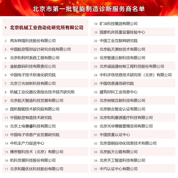 2021年12月22日,北京市經濟和信息化局公布了“北京市第一批智能制造診斷服務商”名單,北京機械工業自動化研究所有限公司(以下簡稱“北自所”)成功入選。