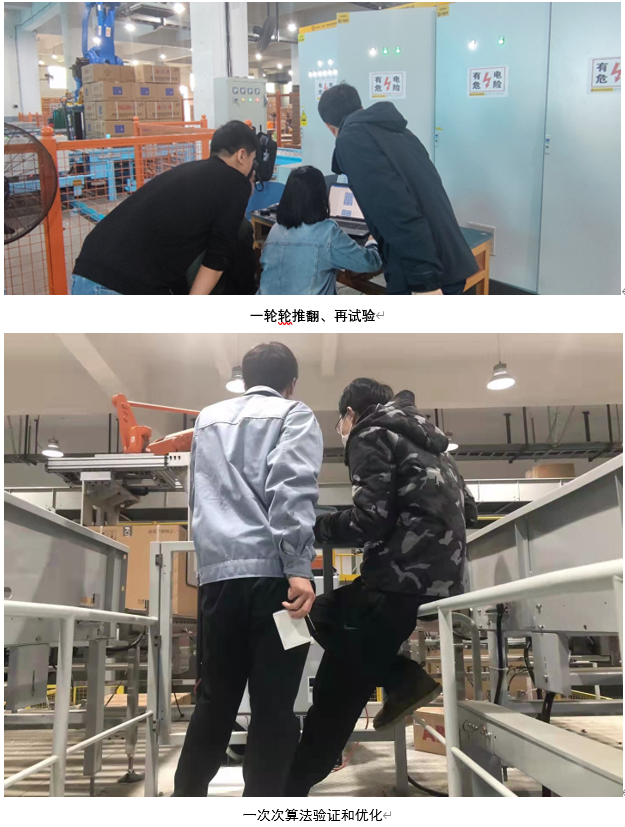 針對這一創(chuàng)新理念,在物流碼垛行業(yè)幾乎是空白,團隊成員可借鑒的成功經(jīng)驗不多,所有的工作都要從零開始。萬事開頭難,項目組成立以后,迅速分工協(xié)作、開展工作。團隊成員根據(jù)已有經(jīng)驗和問題導向,咨詢業(yè)內(nèi)專家分析可行性,提出多種大膽想法,一遍遍地設(shè)計驗證,一次次地推倒重來。從創(chuàng)意的雛形初定到最終柔性碼垛方案的完成,中間經(jīng)歷了無數(shù)波折與困難。那段時間,團隊成員晚上加班編程,白天現(xiàn)場驗證,頂住了巨大的壓力,一路奮斗協(xié)作,“創(chuàng)新之火”在團隊成員心中熊熊燃燒!