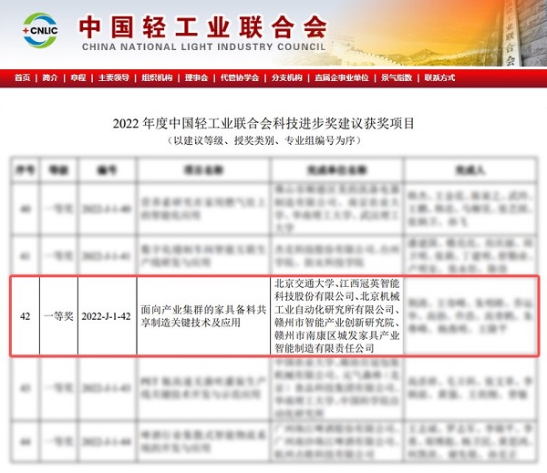 近日,中國輕工業(yè)聯(lián)合會(huì)在官網(wǎng)發(fā)布了經(jīng)評(píng)審?fù)ㄟ^的“2022年度中國輕工業(yè)聯(lián)合會(huì)科學(xué)技術(shù)獎(jiǎng)建議獲獎(jiǎng)項(xiàng)目”名單。北京機(jī)械工業(yè)自動(dòng)化研究所有限公司(簡稱北自所)參與完成的《面向產(chǎn)業(yè)集群的家具備料共享制造關(guān)鍵技術(shù)與應(yīng)用》項(xiàng)目,榮獲2022年度中國輕工業(yè)聯(lián)合會(huì)科技進(jìn)步一等獎(jiǎng)。