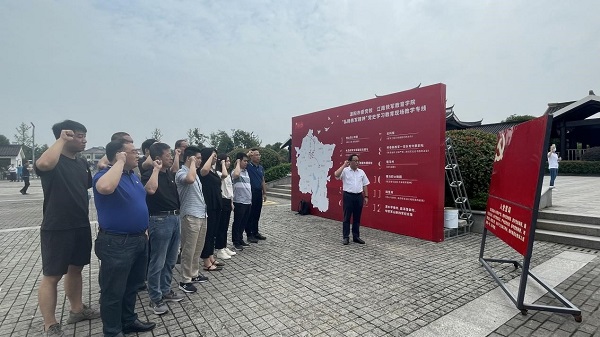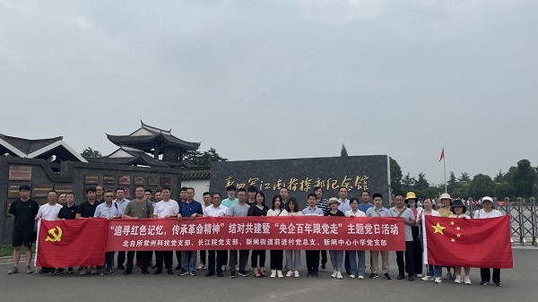 在常州科技黨支部書記張帆的帶領下,北自所常州基地的黨員們在新四軍江南指揮部舊址廣場上重溫了入黨誓詞。全體黨員面向黨旗,高舉右拳重溫入黨誓詞,神情莊重、聲音鏗鏘。