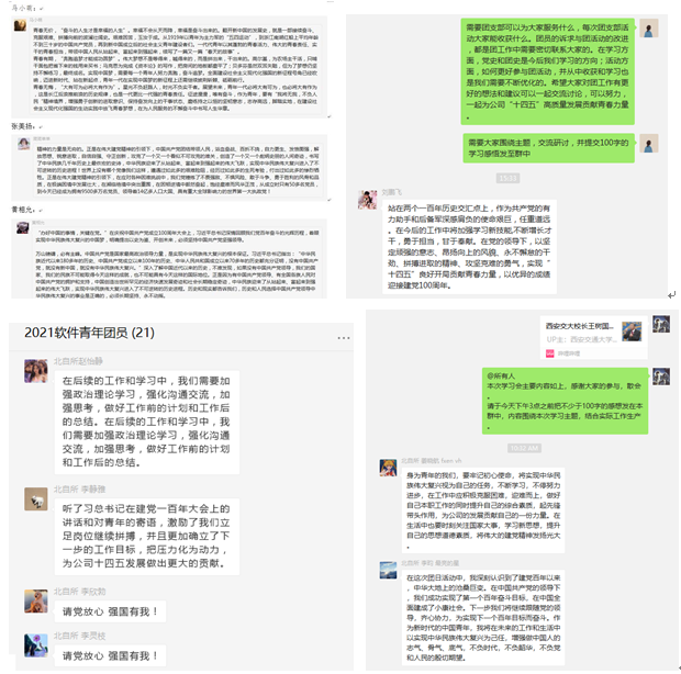 廣大團員紛紛表示,通過學習領會習近平總書記“七一”講話精神,深刻認識到正是在黨的領導下,我們國家和民族才取得了一系列偉大成就,表明將始終堅持和擁護黨的領導;充分理解黨百年來帶領人民獲得民族獨立、謀求民族復興道路的不易,表示將牢記歷史,珍惜當下的幸福生活。同時,團員青年結合自身工作實際,從業務或管理角度,對自身如何北自所“十四五”高質量發展貢獻青春力量進行了交流研討,大家指出,作為新時代青年,要努力為實現中華民族偉大復興貢獻力量,堅定信念目標、矢志艱苦奮斗,在工作崗位上踏實奉獻、鍛煉自我,在公司“十四五”發展的重要機遇期把握機會、努力提升、爭創佳績。